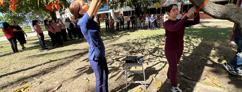 La campaña arrancó hoy en Unipol, con la colocación de listones naranjas de manos de cadetes y personal administrativo, tuvo como finalidad no solo en conmemorar sino un llamado a generar actos, labores, trabajos que fortalezcan el alejar conductas antisociales.